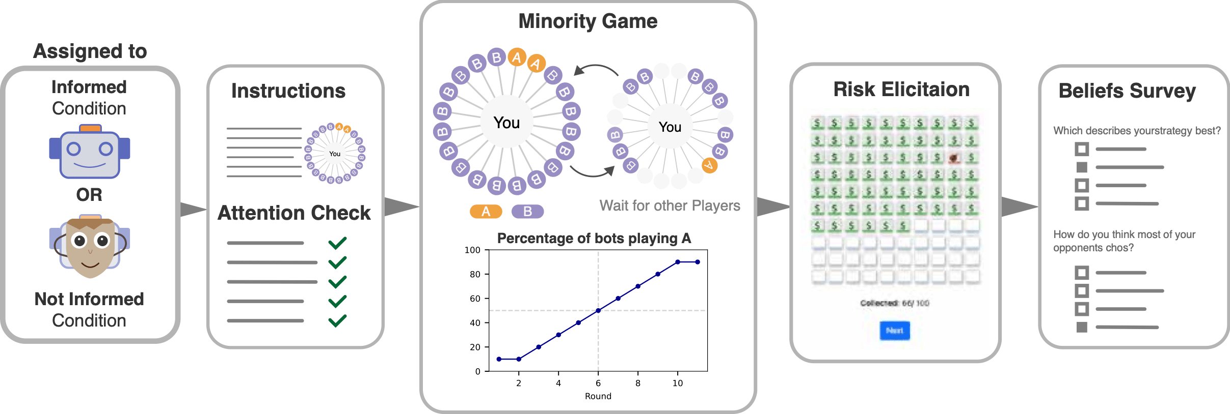 We explore human herding in a strategic setting where humans interact with automated entities (bots) and study the shift in the behaviour and beliefs of humans when they are aware of interacting with bots. The strategic setting is an online minority game, where 1997 participants are rewarded for following the minority strategy. This setting permits distinguishing between irrational herding and rational self-interest—a fundamental challenge in understanding herding in strategic contexts. Moreover, participants were divided into two groups: one informed of playing against bots (informed condition) and the other unaware (not-informed condition). Our findings revealed that while informed participants adjusted their beliefs about bots’ behaviour, their actual decisions remained largely unaffected. In both conditions, 30% of participants followed the majority, contrary to theoretical expectations of no herding. This study underscores the persistence of herding behaviour in human decision-making, even when participants are aware of interacting with automated entities. The insights provide profound implications for understanding human behaviour on digital platforms where interactions with bots are common.